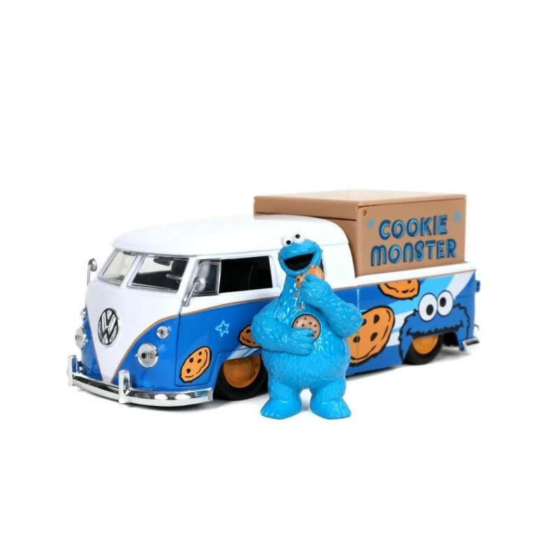This 1962 Volkswagen Bus Pick Up takes its styling cues from the cookie connoisseur. Featuring opening window, doors, rear engine bay and a storage box on the truck bed. This vehicle also includes a talking 2.75″ Cookie Monster die-cast collectible figure and is sure to be a standout in any Sesame Street collection!