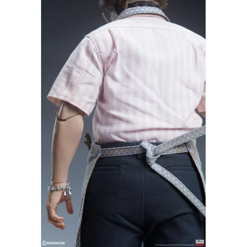The Leatherface Deluxe Sixth Scale Figure includes a number of accessories and alternate costume elements to change up his southern style. Swap to the “old lady” mask portrait and distressed fabric apron to recreate even more scenes surrounding the sickening dinner climax of the film. The figure features a padded fabric under suit to fill out the silhouette and includes Bubba’s tools of the trade for the family meat business- a chainsaw, an antler-handle knife, and a mallet. The killer cannibal comes with eight hands, including a pair of fists, a pair of grip hands, a pair of open hands, and a pair of posed gesture hands for interacting with his accessories, finishing the look with a charm bracelet for his wrist.